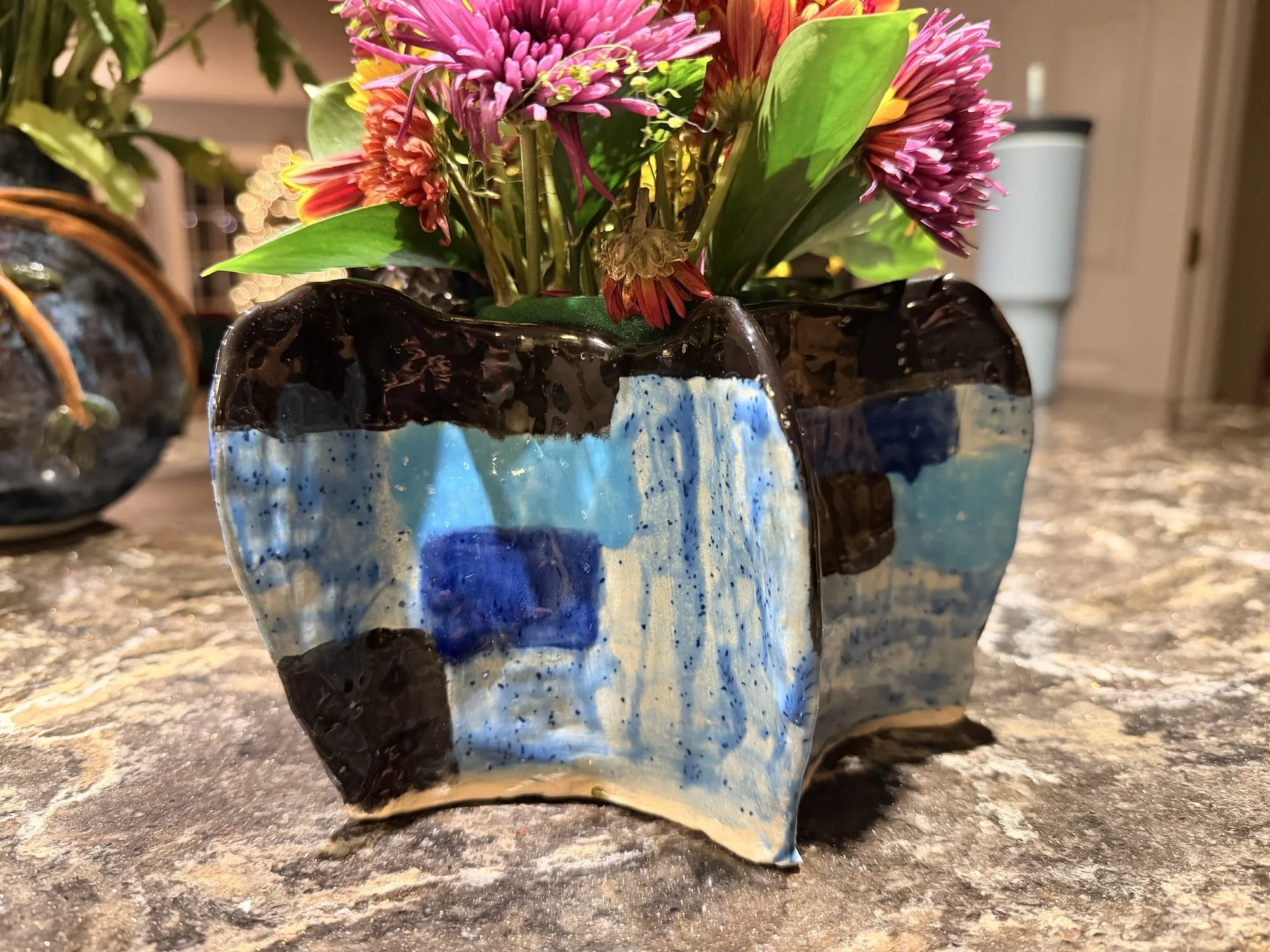 The body of this vase came together slowly, with each plane and curve pushed just past “comfortable.” The result is a form that feels a little defiant: not round, not square, but a bit out there. That irregular profile is what catches the light, throwing small shadows along each angle and making the surface feel alive from every viewpoint.